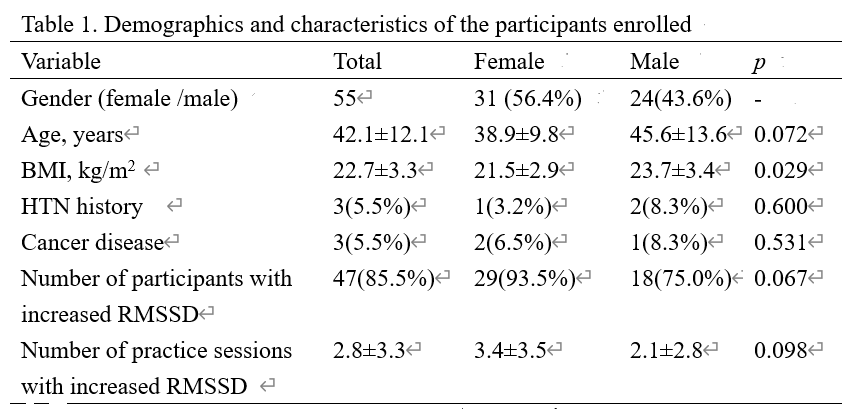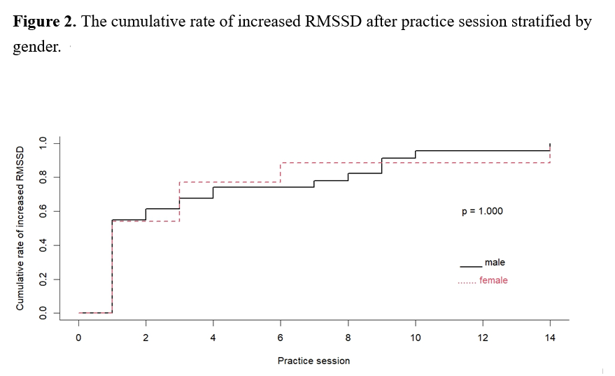 共納入55名參與者進行分析,平均年齡為42.1 ± 12.1歲。男性參與者的體重指數(BMI)高於女性(23.7 ± 3.4 vs. 21.5 ± 2.9 kg/m²,p = 0.029)(見表1)。使用 L.NAR 的參與者,其心率顯著降低(p = 0.023),高頻(HF)與低頻(LF)功率絕對值比值(LF/HF比值)顯著升高,RMSSD 值亦顯著上升(p = 0.038 與 p < 0.001)(見表2)。在所有參與者中,有47人(85.5%)通過測試,即在使用 L.NAR 後 RMSSD 增加,平均需進行2.9 ± 3.4次練習(範圍為1至7次)。男女之間未觀察到顯著差異(p = 1.000)(見圖2)。