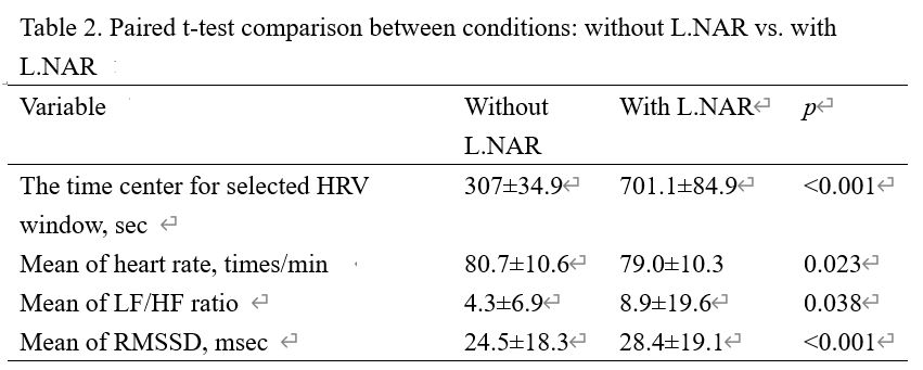 參與者接受了一項測試程序,首先為期8分鐘不使用 L.NAR,接著為期8分鐘使用 L.NAR。若參與者的連續心跳間期平方差均方根(RMSSD)未增加,則鼓勵其繼續練習。研究採用了時間域與頻率域的心率變異性(HRV)分析方法,並使用成對 t 檢定比較使用前與使用 L.NAR 期間的數值變化。
